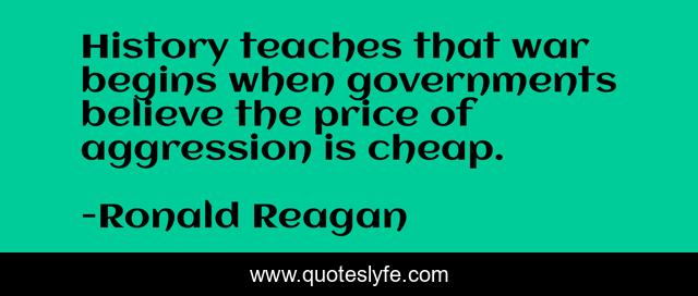 This page presents the quote "History teaches that war begins when governments believe the price of aggression is cheap.". Author of this quote is Ronald Reagan. This quote is about price, believe, history,.