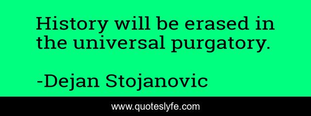 This page presents the quote "History will be erased in the universal purgatory.". Author of this quote is Dejan Stojanovic. This quote is about erased, literature, purgatory, dejan-stojanovic, universal, poetry, wisdom, quotes, thoughts,.