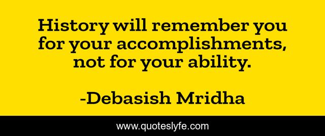 This page presents the quote "History will remember you for your accomplishments, not for your ability.". Author of this quote is Debasish Mridha. This quote is about life, love, knowledge, inspirational, intelligence, philosophy, wisdom, quotes, affection,.