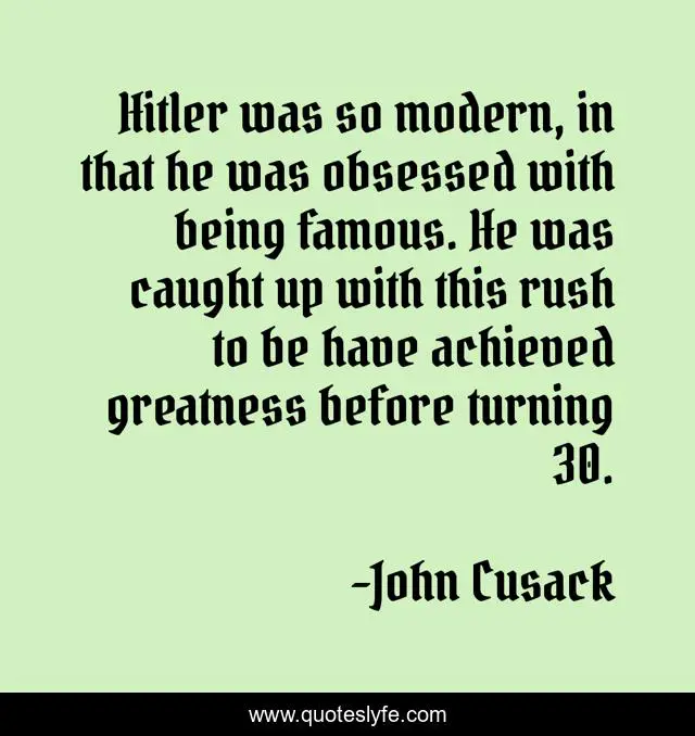 This page presents the quote "Hitler was so modern, in that he was obsessed with being famous. He was caught up with this rush to be have achieved greatness before turning 30.". Author of this quote is John Cusack. This quote is about modern, up, greatness,.
