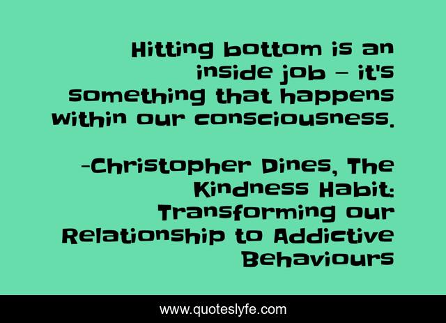 This page presents the quote "Hitting bottom is an inside job — it's something that happens within our consciousness.". Author of this quote is Christopher Dines, The Kindness Habit: Transforming our Relationship to Addictive Behaviours. This quote is about the-kindness-habit, addictiveness, family-of-origin, consciousness, original-pain-work, hitting-bottom, addiction, addiction-and-recovery, grief-and-loss,.