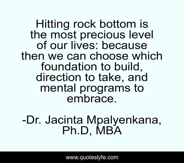 This page presents the quote "Hitting rock bottom is the most precious level of our lives: because then we can choose which foundation to build, direction to take, and mental programs to embrace.". Author of this quote is Dr. Jacinta Mpalyenkana, Ph.D, MBA. This quote is about enthusiasm, mind-power, inspirational, life-lessons,.