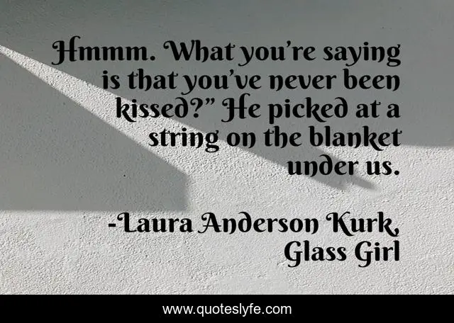 This page presents the quote "Hmmm. What you’re saying is that you’ve never been kissed?” He picked at a string on the blanket under us.". Author of this quote is Laura Anderson Kurk, Glass Girl. This quote is about glass-girl, first-kiss, love, teen-fiction, meg-kavanagh, ya-fiction, young-adult-fiction, henry-whitmire, dating,.