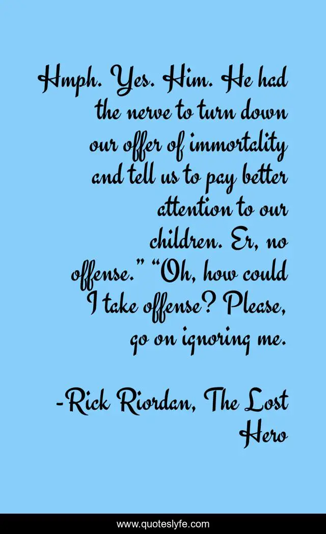 This page presents the quote "Hmph. Yes. Him. He had the nerve to turn down our offer of immortality and tell us to pay better attention to our children. Er, no offense.” “Oh, how could I take offense? Please, go on ignoring me.". Author of this quote is Rick Riordan, The Lost Hero. This quote is about humour, the-lost-hero, leo-valdez, greek-gods, heroes-of-olympus, children,.