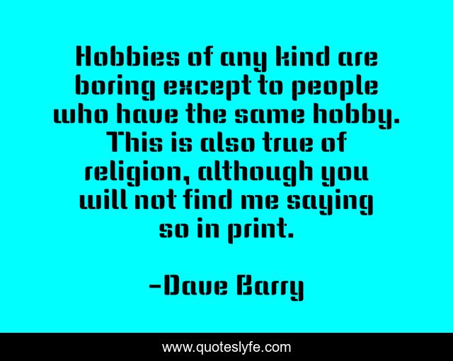 This page presents the quote "Hobbies of any kind are boring except to people who have the same hobby. This is also true of religion, although you will not find me saying so in print.". Author of this quote is Dave Barry. This quote is about religion, humor,.