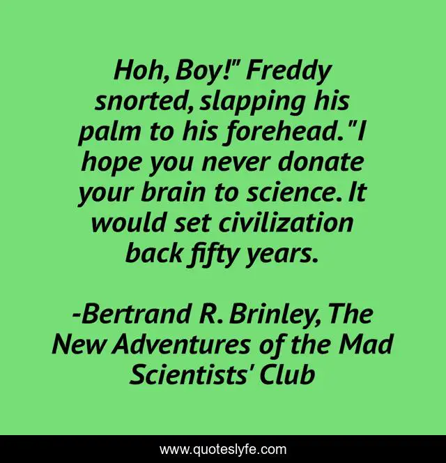 "Bertrand R. Brinley, The New Adventures of the Mad Scientists' Club Quotes." Quoteslyfe.com, 2025. Mon. 08 Dec. 2025. <https://www.quoteslyfe.com/quote/Hoh-Boy-Freddy-snorted-slapping-his-palm-42283>.