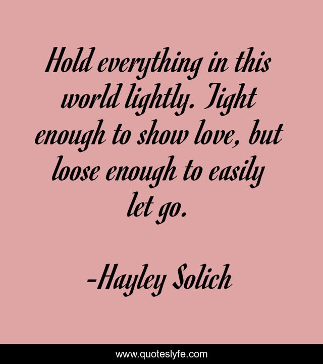 This page presents the quote "Hold everything in this world lightly. Tight enough to show love, but loose enough to easily let go.". Author of this quote is Hayley Solich. This quote is about enthusiasm, love, inspirational, affection, wisdom,.