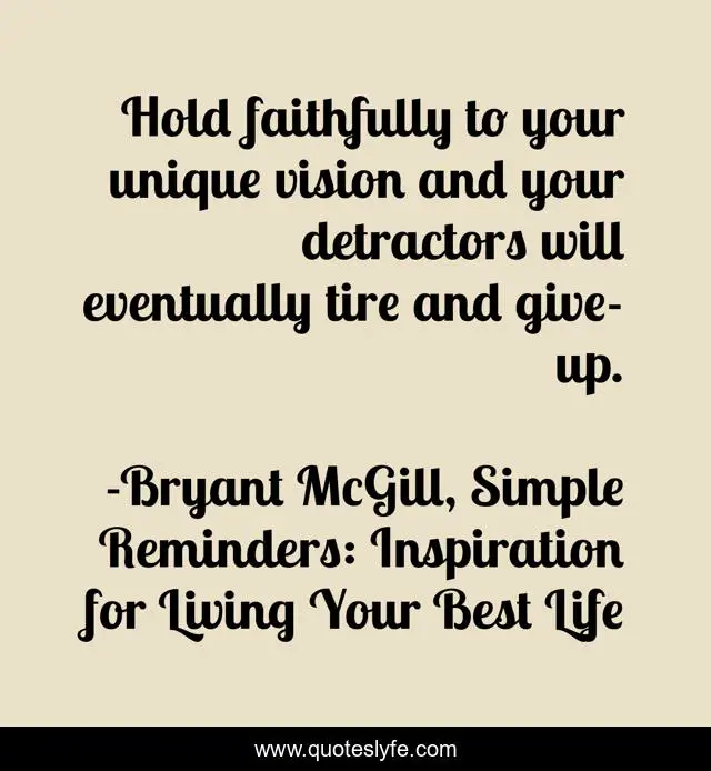This page presents the quote "Hold faithfully to your unique vision and your detractors will eventually tire and give-up.". Author of this quote is Bryant McGill, Simple Reminders: Inspiration for Living Your Best Life. This quote is about faith, uniqueness, detractors, vision,.
