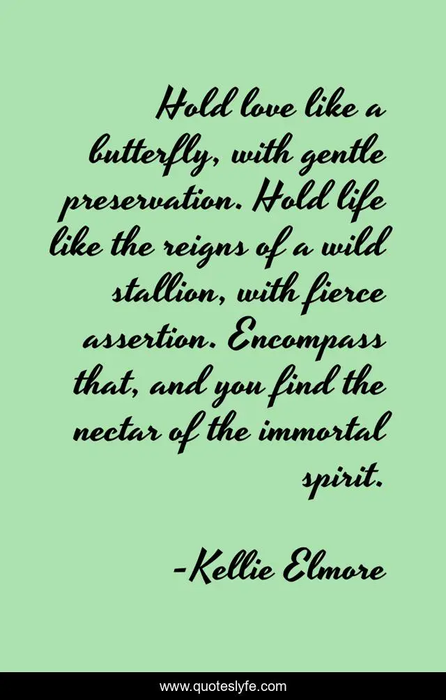 This page presents the quote "Hold love like a butterfly, with gentle preservation. Hold life like the reigns of a wild stallion, with fierce assertion. Encompass that, and you find the nectar of the immortal spirit.". Author of this quote is Kellie Elmore. This quote is about life, attitude-toward-life, love, philosophy, inspirational, quotes-to-live-by, enthusiasm, life-and-living, affection,.