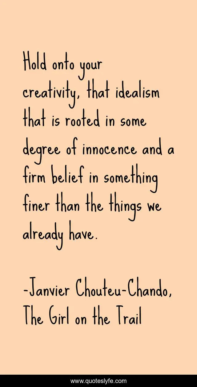 "Janvier Chouteu-Chando, The Girl on the Trail Quotes." Quoteslyfe.com, 2025. Fri. 05 Dec. 2025. <https://www.quoteslyfe.com/quote/Hold-onto-your-creativity-that-idealism-that-13649>.