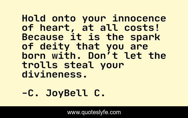This page presents the quote "Hold onto your innocence of heart, at all costs! Because it is the spark of deity that you are born with. Don’t let the trolls steal your divineness.". Author of this quote is C. JoyBell C.. This quote is about warnings, advice, deity-of-soul, innocence-of-soul, divineness, the-nature-of-innocence, innocence, trolls, guidance,.