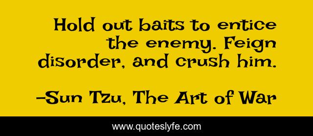 This page presents the quote "Hold out baits to entice the enemy. Feign disorder, and crush him.". Author of this quote is Sun Tzu, The Art of War. This quote is about war, strategy,.