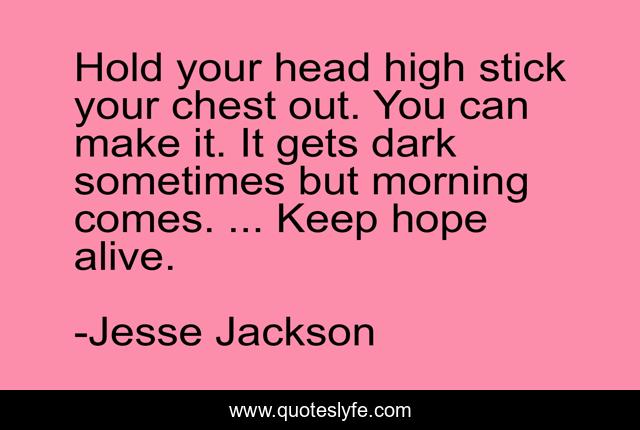 This page presents the quote "Hold your head high stick your chest out. You can make it. It gets dark sometimes but morning comes. ... Keep hope alive.". Author of this quote is Jesse Jackson. .
