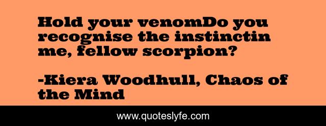 This page presents the quote "Hold your venomDo you recognise the instinctin me, fellow scorpion?". Author of this quote is Kiera Woodhull, Chaos of the Mind. This quote is about zodiac, strength, poetry,.