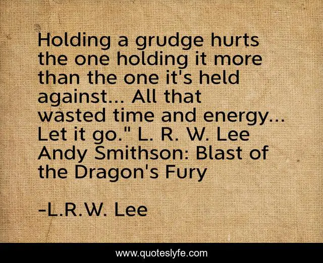 This page presents the quote "Holding a grudge hurts the one holding it more than the one it's held against... All that wasted time and energy... Let it go." L. R. W. Lee Andy Smithson: Blast of the Dragon's Fury". Author of this quote is L.R.W. Lee. This quote is about life-lesson, life-philosophy, life-experience,.