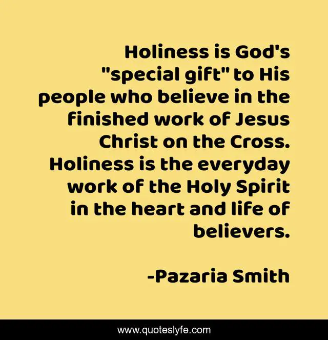 This page presents the quote "Holiness is God's "special gift" to His people who believe in the finished work of Jesus Christ on the Cross. Holiness is the everyday work of the Holy Spirit in the heart and life of believers.". Author of this quote is Pazaria Smith. This quote is about heart, life, holiness, god, everyday, holy-spirit,.
