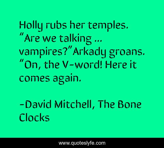 This page presents the quote "Holly rubs her temples. “Are we talking ... vampires?”Arkady groans. “On, the V-word! Here it comes again.". Author of this quote is David Mitchell, The Bone Clocks. .