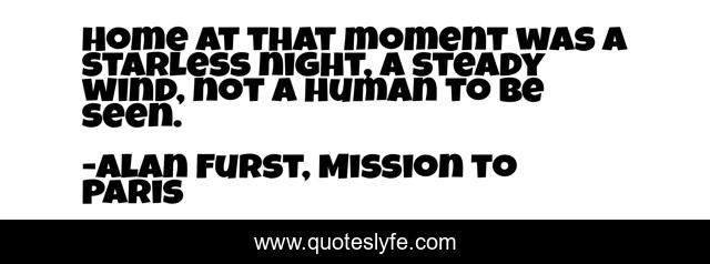 This page presents the quote "Home at that moment was a starless night, a steady wind, not a human to be seen.". Author of this quote is Alan Furst, Mission to Paris. This quote is about home, travel, nature,.
