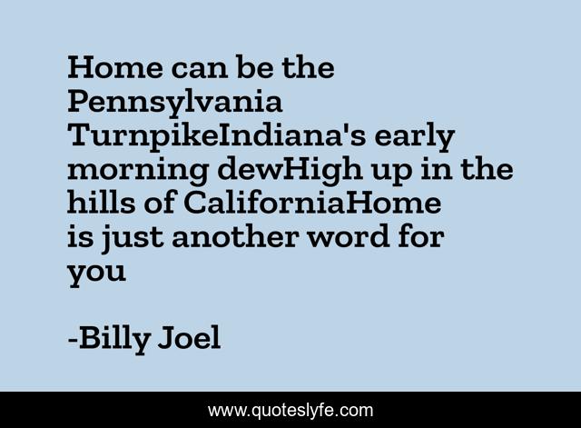 This page presents the quote "Home can be the Pennsylvania TurnpikeIndiana's early morning dewHigh up in the hills of CaliforniaHome is just another word for you". Author of this quote is Billy Joel. This quote is about home, love, lyrics, affection,.