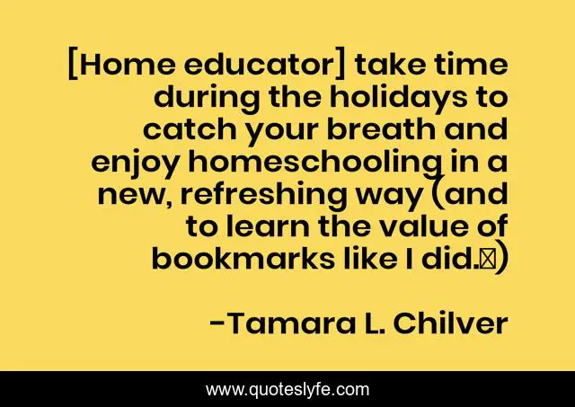 This page presents the quote "[Home educator] take time during the holidays to catch your breath and enjoy homeschooling in a new, refreshing way (and to learn the value of bookmarks like I did.☺)". Author of this quote is Tamara L. Chilver. This quote is about homekeeper, christian, homeschool, homeschool-authors, homeschool-mom-encouragement, inspirational, grace-filled-homeschool, enthusiasm, the-battle-is-real,.