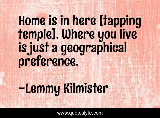 This page presents the quote "Home is in here [tapping temple]. Where you live is just a geographical preference.". Author of this quote is Lemmy Kilmister. This quote is about home, mindset,.