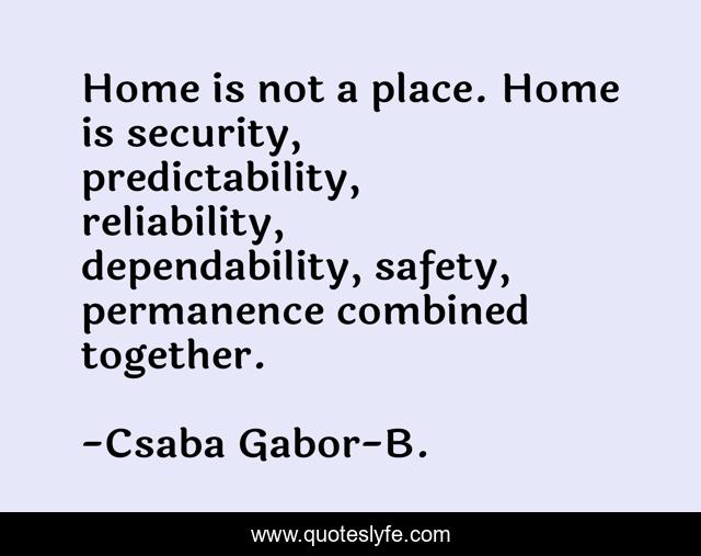 This page presents the quote "Home is not a place. Home is security, predictability, reliability, dependability, safety, permanence combined together.". Author of this quote is Csaba Gabor-B.. This quote is about dependability, love, relationship, safefty, team-work, people, reliability, home, security,.