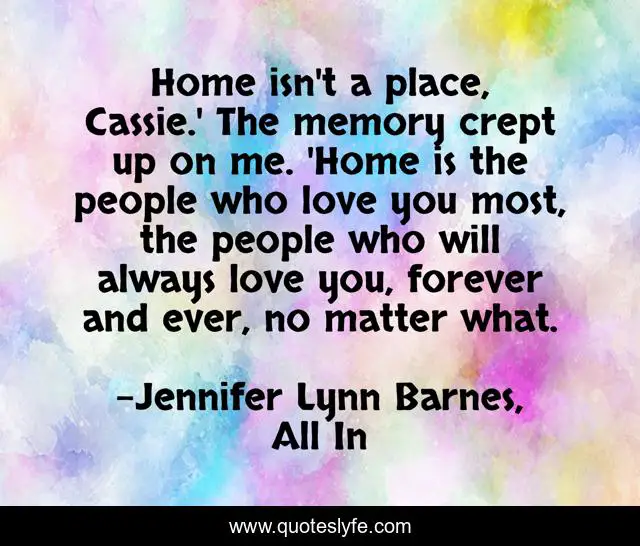 This page presents the quote "Home isn't a place, Cassie.' The memory crept up on me. 'Home is the people who love you most, the people who will always love you, forever and ever, no matter what.". Author of this quote is Jennifer Lynn Barnes, All In. This quote is about all-in, love, people, jennifer-lynn-barnes, cassie, home, affection,.