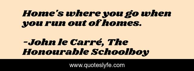 This page presents the quote "Home's where you go when you run out of homes.". Author of this quote is John le Carré, The Honourable Schoolboy. This quote is about belonging, homecoming, attachment, homelessness, home, anchoring, roots,.
