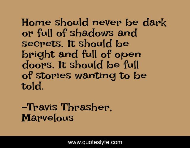 This page presents the quote "Home should never be dark or full of shadows and secrets. It should be bright and full of open doors. It should be full of stories wanting to be told.". Author of this quote is Travis Thrasher, Marvelous. This quote is about travis-thrasher, marvelous, ya, the-books-of-marvella, brandon,.