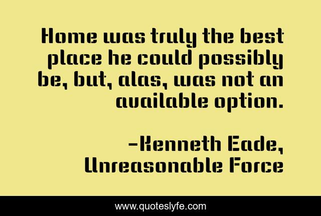 This page presents the quote "Home was truly the best place he could possibly be, but, alas, was not an available option.". Author of this quote is Kenneth Eade, Unreasonable Force. This quote is about leaving-home, home, coming-home, home-sweet-home,.