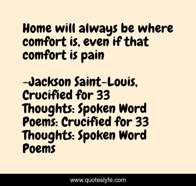 "Jackson Saint-Louis, Crucified for 33 Thoughts: Spoken Word Poems: Crucified for 33 Thoughts: Spoken Word Poems Quotes." Quoteslyfe.com, 2025. Fri. 05 Dec. 2025. <https://www.quoteslyfe.com/quote/Home-will-always-be-where-comfort-is-204589>.