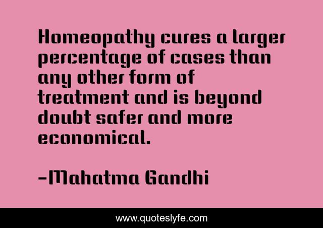 This page presents the quote "Homeopathy cures a larger percentage of cases than any other form of treatment and is beyond doubt safer and more economical.". Author of this quote is Mahatma Gandhi. This quote is about naturopathy, health, homeopathy, cure-diseases-without-medicines, wellbeing,.