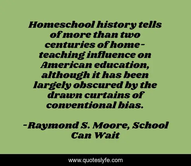 This page presents the quote "Homeschool history tells of more than two centuries of home-teaching influence on American education, although it has been largely obscured by the drawn curtains of conventional bias.". Author of this quote is Raymond S. Moore, School Can Wait. This quote is about homeschool, education,.