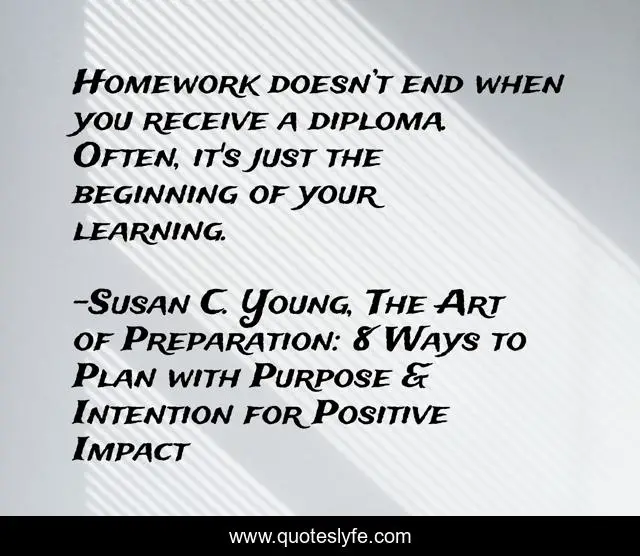 "Susan C. Young, The Art of Preparation: 8 Ways to Plan with Purpose & Intention for Positive Impact Quotes." Quoteslyfe.com, 2025. Sat. 13 Dec. 2025. <https://www.quoteslyfe.com/quote/Homework-doesn-t-end-when-you-receive-227494>.