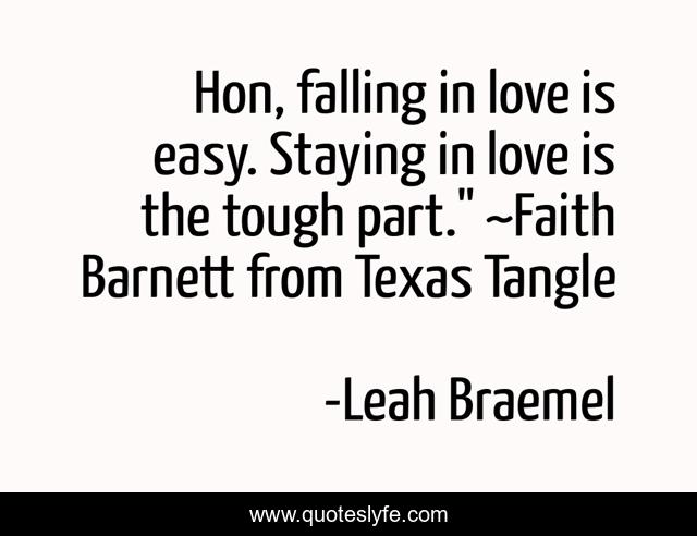 This page presents the quote "Hon, falling in love is easy. Staying in love is the tough part." ~Faith Barnett from Texas Tangle". Author of this quote is Leah Braemel. This quote is about staying-in-love, love, falling-in-love, affection,.