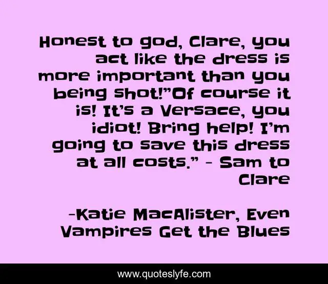 This page presents the quote "Honest to god, Clare, you act like the dress is more important than you being shot!”Of course it is! It’s a Versace, you idiot! Bring help! I’m going to save this dress at all costs.” - Sam to Clare". Author of this quote is Katie MacAlister, Even Vampires Get the Blues. .