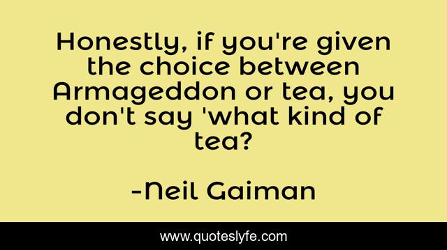 This page presents the quote "Honestly, if you're given the choice between Armageddon or tea, you don't say 'what kind of tea?". Author of this quote is Neil Gaiman. This quote is about tea, armageddon, choice,.