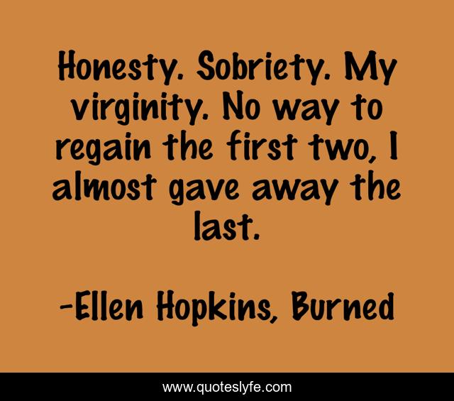 This page presents the quote "Honesty. Sobriety. My virginity. No way to regain the first two, I almost gave away the last.". Author of this quote is Ellen Hopkins, Burned. This quote is about virginity, liar, honesty, ellen-hopkins, lust, love, burned, affection, sobriety,.