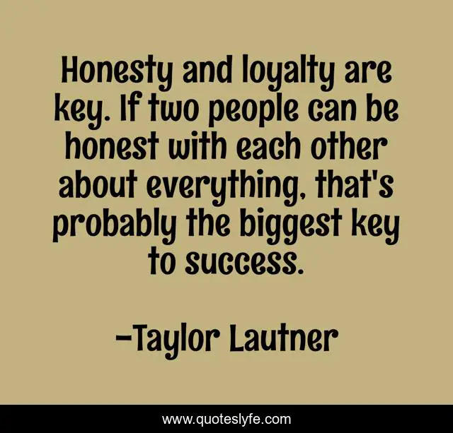 This page presents the quote "Honesty and loyalty are key. If two people can be honest with each other about everything, that's probably the biggest key to success.". Author of this quote is Taylor Lautner. This quote is about honesty, loyalty, people,.