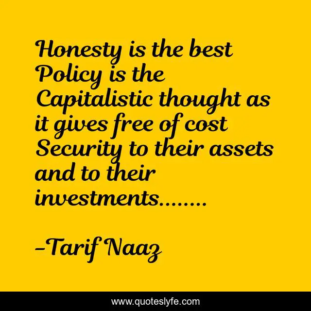 This page presents the quote "Honesty is the best Policy is the Capitalistic thought as it gives free of cost Security to their assets and to their investments........". Author of this quote is Tarif Naaz. This quote is about honesty, capitalism, capitalistic, capitalist, policy, dishonesty,.