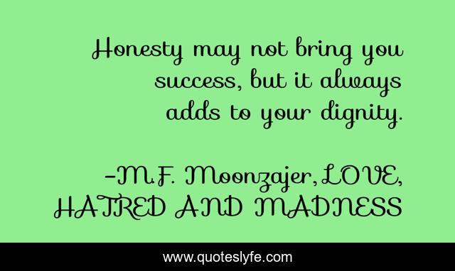 This page presents the quote "Honesty may not bring you success, but it always adds to your dignity.". Author of this quote is M.F. Moonzajer, LOVE, HATRED AND MADNESS. This quote is about dignity, honesty, success,.