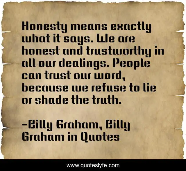 This page presents the quote "Honesty means exactly what it says. We are honest and trustworthy in all our dealings. People can trust our word, because we refuse to lie or shade the truth.". Author of this quote is Billy Graham, Billy Graham in Quotes. This quote is about truth, billy-graham,.