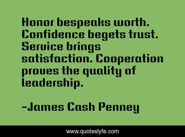This page presents the quote "Honor bespeaks worth. Confidence begets trust. Service brings satisfaction. Cooperation proves the quality of leadership.". Author of this quote is James Cash Penney. This quote is about confidence, trust, service,.