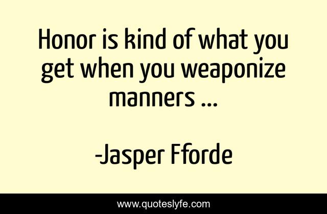 This page presents the quote "Honor is kind of what you get when you weaponize manners ...". Author of this quote is Jasper Fforde. This quote is about funny, comedy, insightful,.