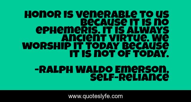 This page presents the quote "Honor is venerable to us because it is no ephemeris. It is always ancient virtue. We worship it today because it is not of today.". Author of this quote is Ralph Waldo Emerson, Self-Reliance. This quote is about honor, virtue,.
