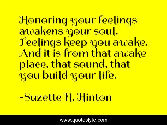 This page presents the quote "Honoring your feelings awakens your soul. Feelings keep you awake. And it is from that awake place, that sound, that you build your life.". Author of this quote is Suzette R. Hinton. This quote is about sound, awaken, life-and-living, soul,.