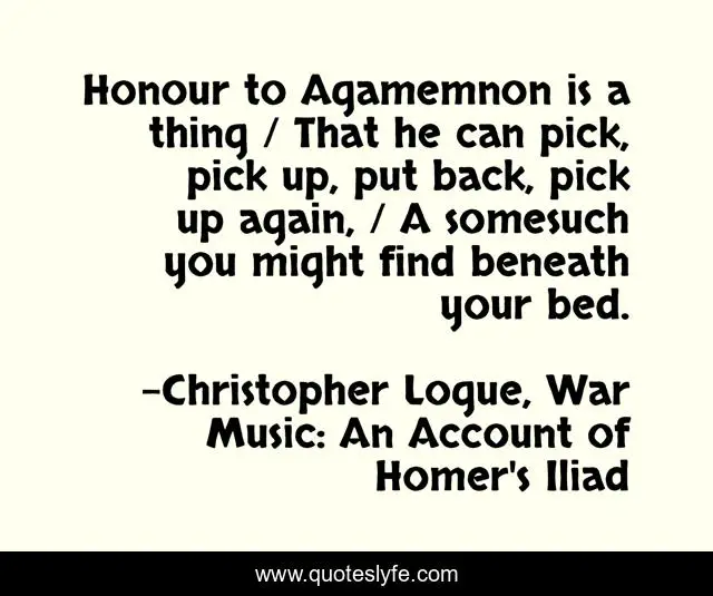 This page presents the quote "Honour to Agamemnon is a thing / That he can pick, pick up, put back, pick up again, / A somesuch you might find beneath your bed.". Author of this quote is Christopher Logue, War Music: An Account of Homer's Iliad. This quote is about homer, agamemnon, honor, iliad,.