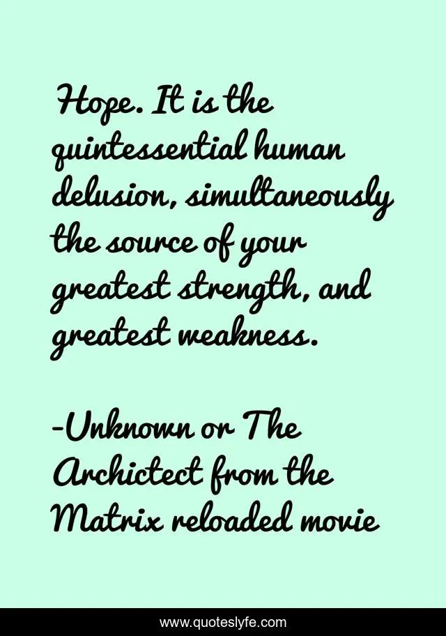 "Unknown or The Archictect from the Matrix reloaded movie Quotes." Quoteslyfe.com, 2025. Sat. 06 Dec. 2025. <https://www.quoteslyfe.com/quote/Hope-It-is-the-quintessential-human-delusion-104757>.