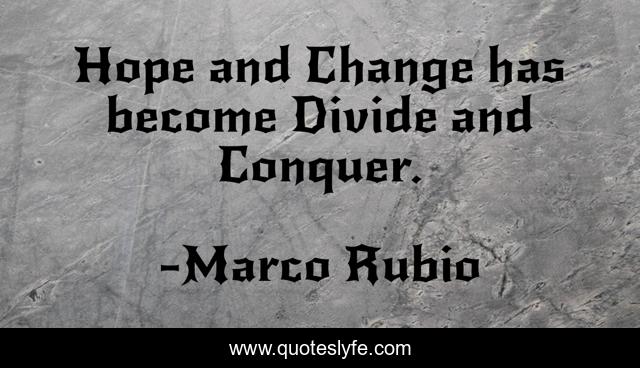This page presents the quote "Hope and Change has become Divide and Conquer.". Author of this quote is Marco Rubio. This quote is about become, conquer, change,.