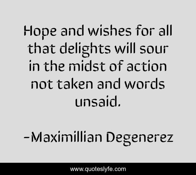 This page presents the quote "Hope and wishes for all that delights will sour in the midst of action not taken and words unsaid.". Author of this quote is Maximillian Degenerez. This quote is about action, wishes, words,.